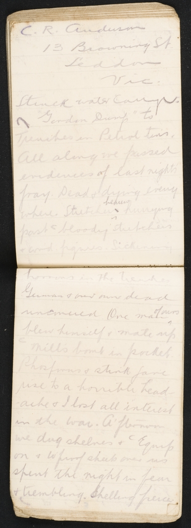 Struck water Camp. From "Gordon Dump" to Trenches in Petrol tins. All along we passed evidences of last night's fray. Dead & dying every where. Stretcher bearers hurrying past with bloody stretchers & wnd. figures. Sickening horrors in the trenches Germans & our own dead uncovered. One man of ours blew himself & mate up with Mills bomb in pocket. Phosforus & stink fare use to a horrible headache & I lost all interest in the war. A'fternoon we dug shelves & with Equip on & W'proof sheets over us spent the night in fear & trembling. Shelling fierce.
