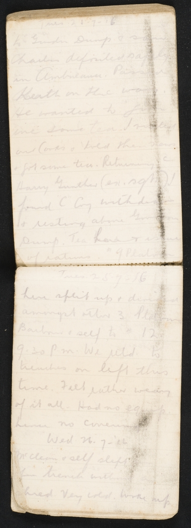 to Gordon Dump & saw Charlie deposited safely in Ambulance. Passed Keith on the way. He wanted to give me some tea. I visited our Cooks & told them news & got some tea. Returning with Harry Gunther (ex. Sgt) I found 'C" Coy withdrawn & resting above German Dump. Tea had & issue of rations. #9 Platoon
