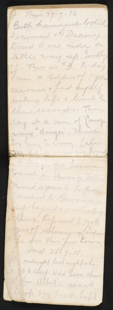 Both haversacks looted. Discovered 1st Diary tossed to one side a little way up. Goodbye #2. This is #3. To-day I am a soldier of 1 yrs service & find myself risking life & limb for these records. These days it's a case of "Courage rising with danger". Much too busy to worry. Later on 8 a.m. or so we found "C" Coy in old German trench in Sausage Valley. Moved again 6.30 p.m. Marched to Bivouac beyond & overlooking Albert. . Rejoiced to note signs of returning Civilian life in this fine town.