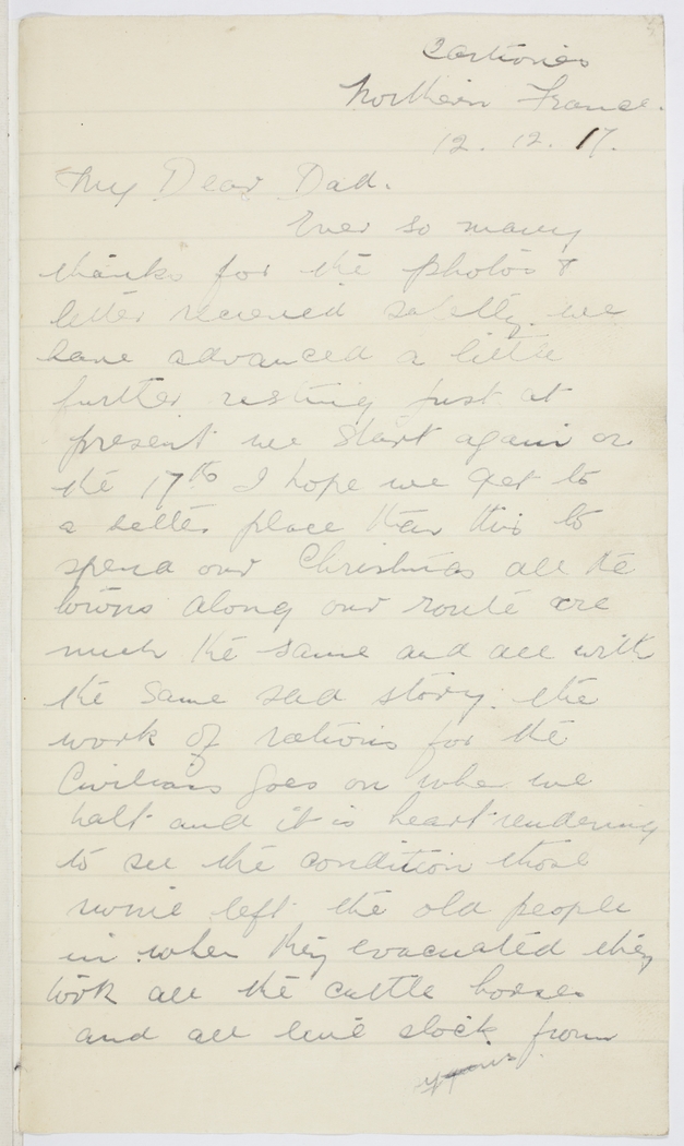 Ever so many thanks for the photos & letter received safely. We have advanced a little further resting just at present we start again on the 17th. I hope we get to a better place than this to spend our Christmas as all the towns along our route are much the same and all with the same sad story. The work of rations for the Civilians goes on when we halt and it is heart rendering to see the condition those swine left the old people in. When they evacuated they took all the cattle, horses and all live stock from