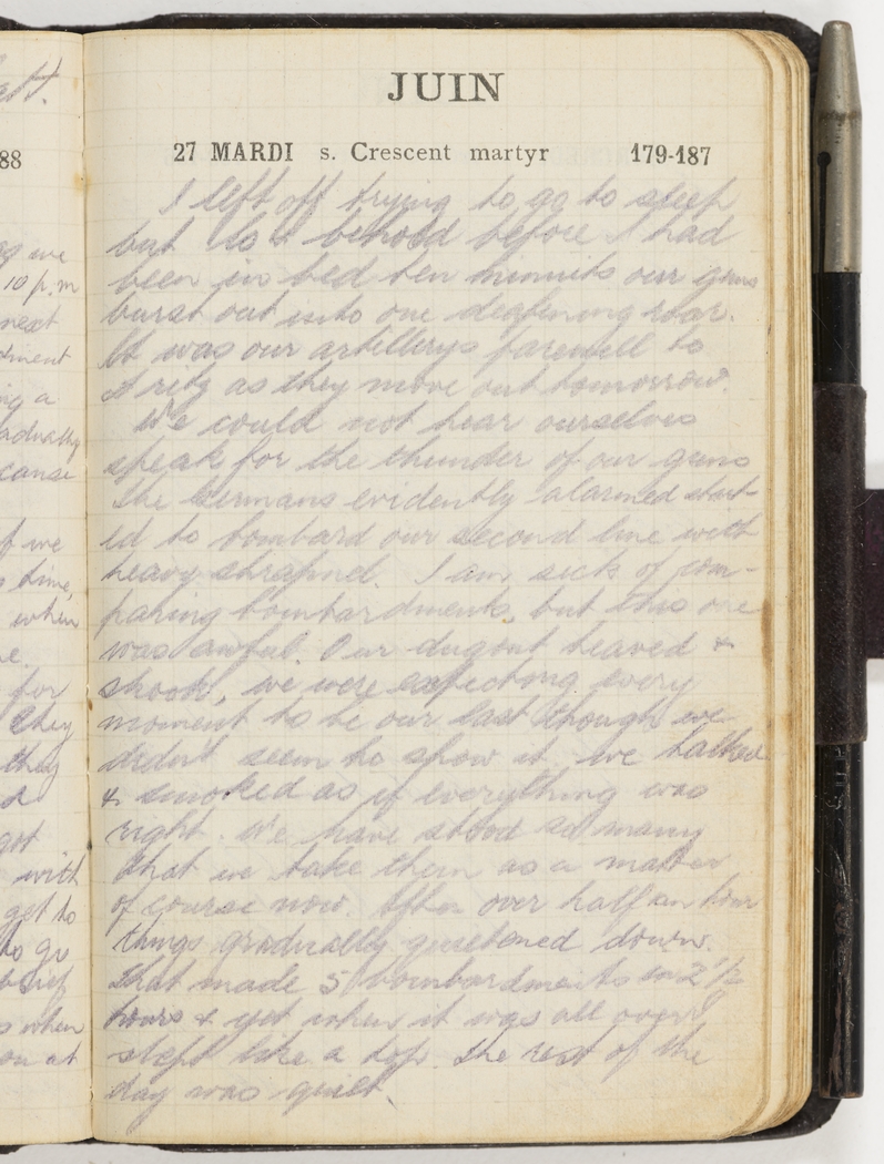 We could not hear ourselves speak for the thunder of our guns The Germans evidently alarmed started to bombard our second line with heavy shrapnel. I am sick of comparing bombardments, but this one was awful. Our dugout heaved & shook, we were expecting every moment to be our last though we didn't seem to show it. We talked & smoked as if everything was right. We have stood so many that we take them as a matter of course now. After over half an hour things gradually quietened down. That made 5 bombardments in 2 ½ hours & yet when it was all over I slept like a top. The rest of the day was quiet.