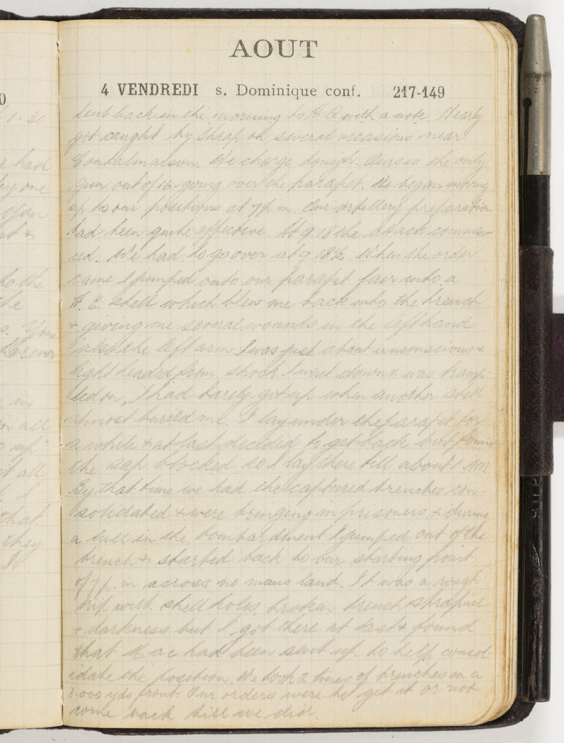 Sent back in the morning to H.Q. with a note. Nearly got caught by Shrap on several occasions near Contalmaison. We charge tonight. Our is the only gun out of 16, going over the parapet. We began moving up to our positions at 7p.m. Our artillery preparation had been quite effective. At 9.18 the attack commenced. We had to go over at 9.18 ½. When the order came I jumped onto our parapet fair into a H.E. shell which blew me back into the trench & giving me several wounds in the left hand also the left arm. I was just about unconscious & light headed from shock. I went down & was trampled on, I had barely got up when another shell almost buried me. I lay under the parapet for a while & at last decided to get back but found the sap blocked so I lay there till about 1 AM. By that time we had the captured trenches consolidated & were bringing in prisoners & during a lull in the bombardment I jumped out of the trench & started back to our starting point of 7p.m. across no mans land. It was a rough trip with shellholes, broken trench shrapnel & darkness but I got there at last & found that Mac had been sent up to help consolidate the position. We took 2 lines of trenches on a 3,000 yds front. Our orders were to get it or not come back till we did.