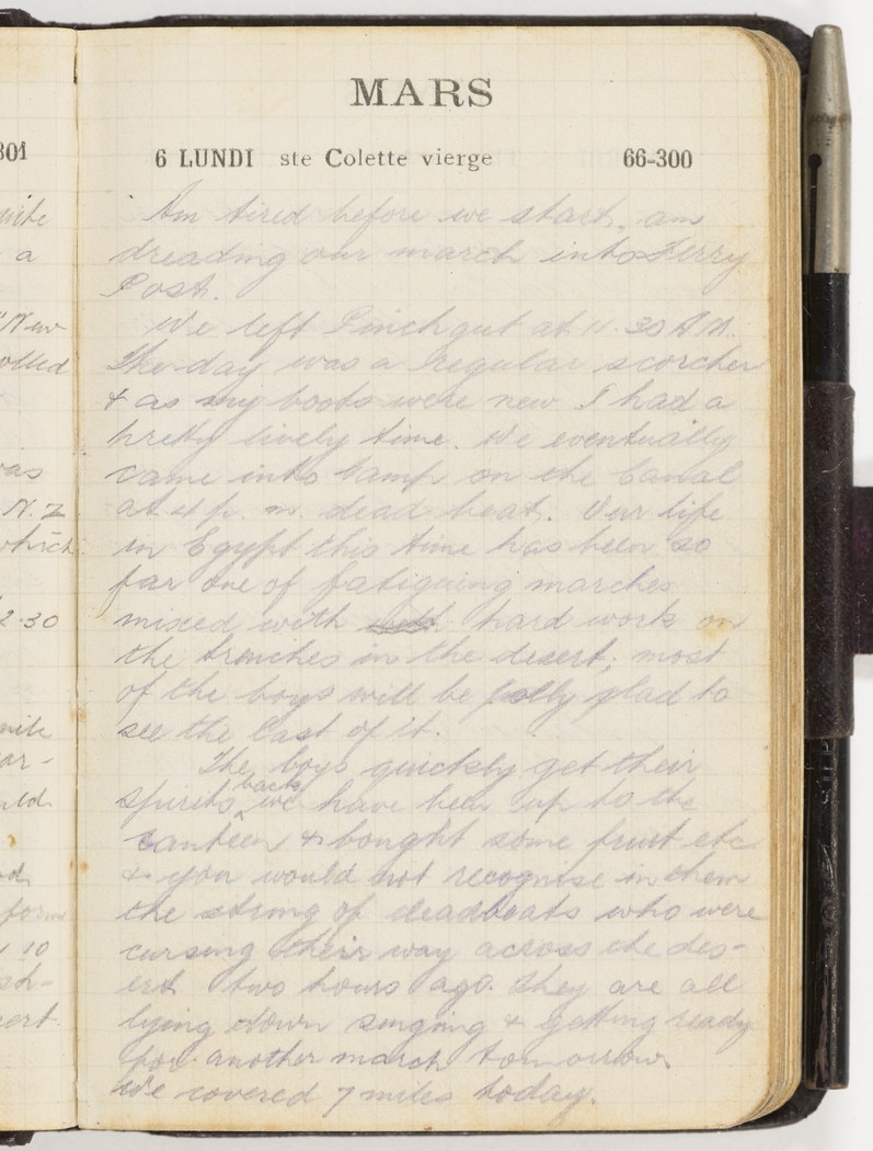 We left Pinchgut at 11.30 A.M.. The day was a regular scorcher & as my boots were new I had a pretty lively time. We eventually came into camp on the Canal at 4 p.m. am dead beat. Our life in Egypt this time has been so far one of fatiguing marches mixed with hard work on the trenches in the desert; most of the boys will be jolly glad to see the last of it.