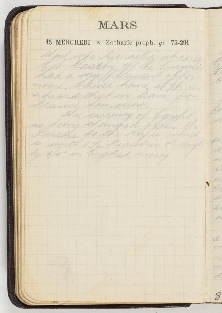 Went into Ismailia at 12:30. Met Baseby [?] off the Euryalis [Euryalus] had a very pleasant afternoon. Arrived home at 7 p.m. & heard that we leave for France tomorrow.