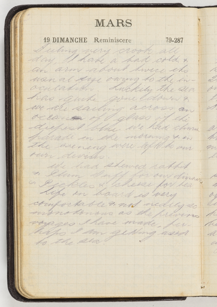 Feeling very crook all day, I have had a cold & an arm about twice its usual size owing to the inoculation. Luckily the sea has quite gone down & we are sailing across an ocean of glass of the deepest blue. We had church parade in the morning & in the evening were left to our own devices.