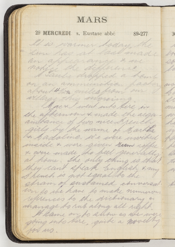 Mac & I went into Aire [Aire-sur-la-Lys] in the afternoon & made the acquaintance of two nice French girls by the name of Marthe & Madoline. We were invited inside & were given rum coffee & were made to feel generally at home. The only thing is that they can't speak English & my French is not equal to the strain of sustained conversation so we have to make numerous references to the dictionary & manage to rub along all right.