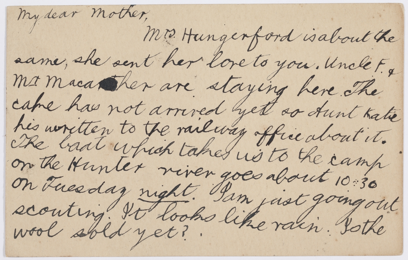 Mrs Hungerford is about the same, she sent her love to you. Uncle F & Mr Macarther [Macathur] are staying here. The cake has not arrived yet so Aunt Katie has written to the railway office about it. The boat which takes us to the camp on the Hunter river goes about 10:30 on Tuesday night. I am just going out scouting. It looks like rain. Is the wool sold yet?