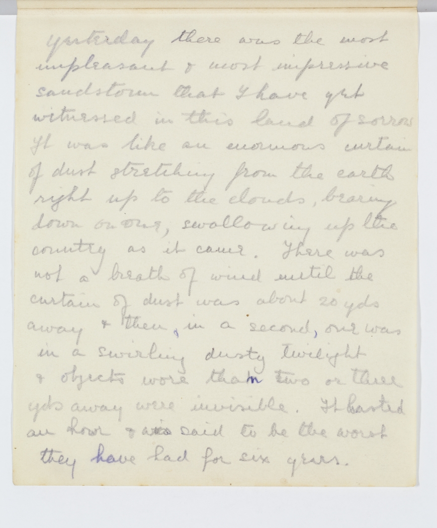 Yesterday there was the most unpleasant & most impressive sandstorm that I have yet witnessed in this land of sorrow. It was like an enormous curtain of dust stretching from the earth right up to the clouds, breaking down on one, swallowing up the country as it came. There was not a breath of wind until the curtain of dust was about 20 yards away & then, in a second, one was in a swirling dusty twilight & objects more than two or three yds away were invisible. It lasted an hour & was said to be the worst they have had for six years.