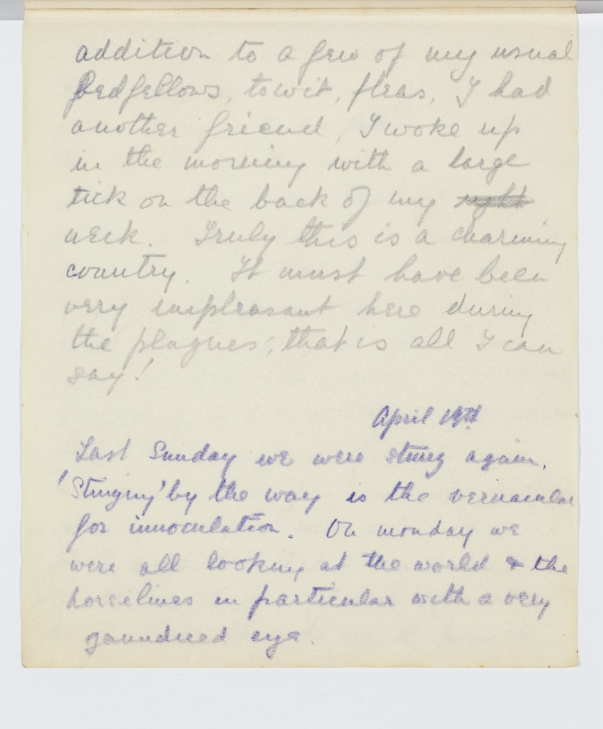 addition to a few of my usual bedfellows, to wit, fleas, I had another friend. I woke up in the morning with a large tick on the back of my right neck. Truly this is a charming country. It must have been very unpleasant here during the plagues, that is all I can say!
