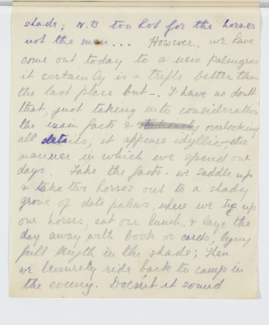 shade; N.B. too hot for the horses not the men …. However, we have come out today to a new palmgrove it certainly is a trifle better than the last place but -. I have no doubt that just taking into consideration the main facts & overlooking all details, it appears idyllic, – the manner in which we spend our days. Take the facts. We saddle up & take two horses out to a shady grove of date palms, where we tie up our horses, eat our lunch & laze the day away with book or cards, lying full length on the shade; Then we leisurely ride back to camp in the evening. Does n't it sound