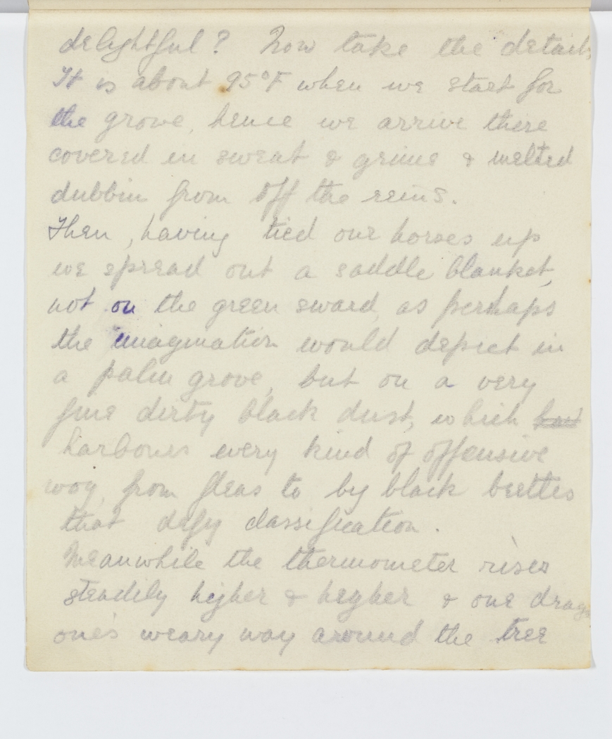 delightful? Now take the details. It is about 95 °ree; F when we start for the grove, hence we arrive these4 covered in sweat & grime & melted dubbin from off the reins: Then, having tied our horses up we spread out a saddle blanket now on the green sward as perhaps the imagination would depict in a palm grove, but on a very fine dirty black dust, which harbours every kind of offensive wog from fleas to big black beetles that defy classification.