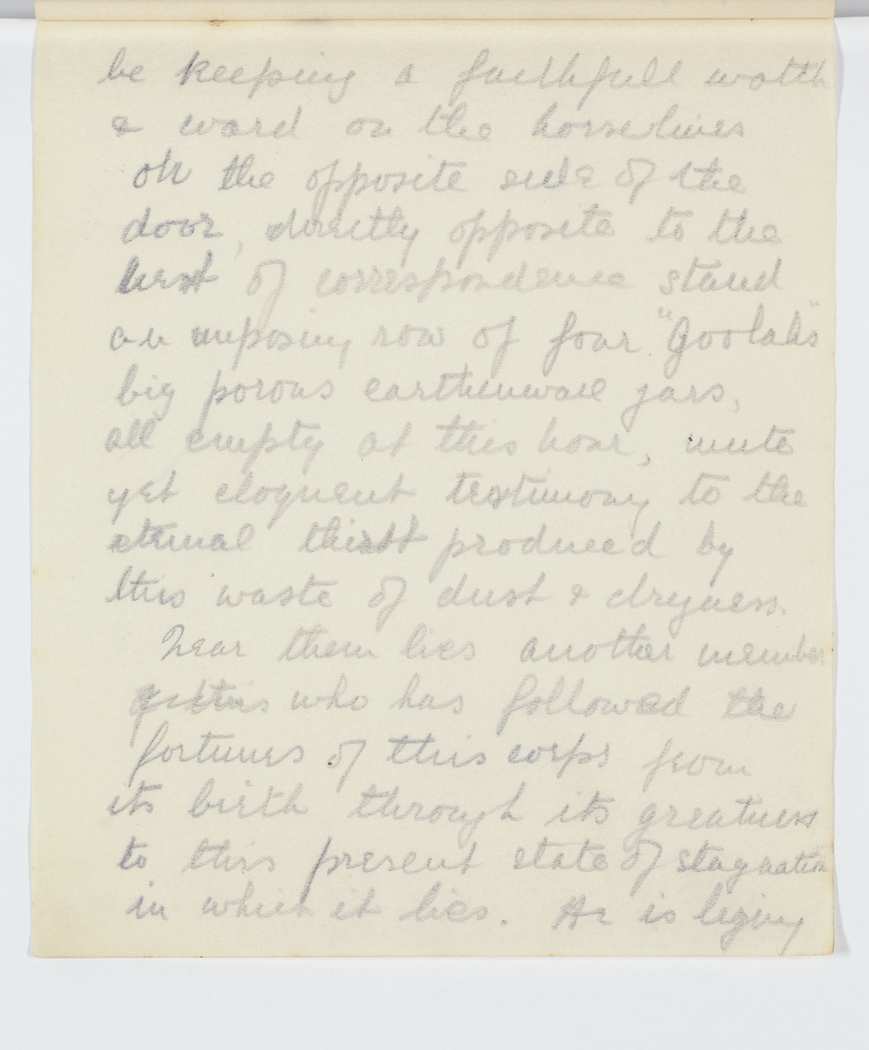 be keeping a faithful watch & ward on the horselines. On the opposite side of the door, directly opposite to the burst of correspondence stand an imposing row of four "Goolahs" big porous earthenware jars, all empty at this hour, mute yet eloquent testimony to the eternal thirst produced by this waste of dust & dryness.