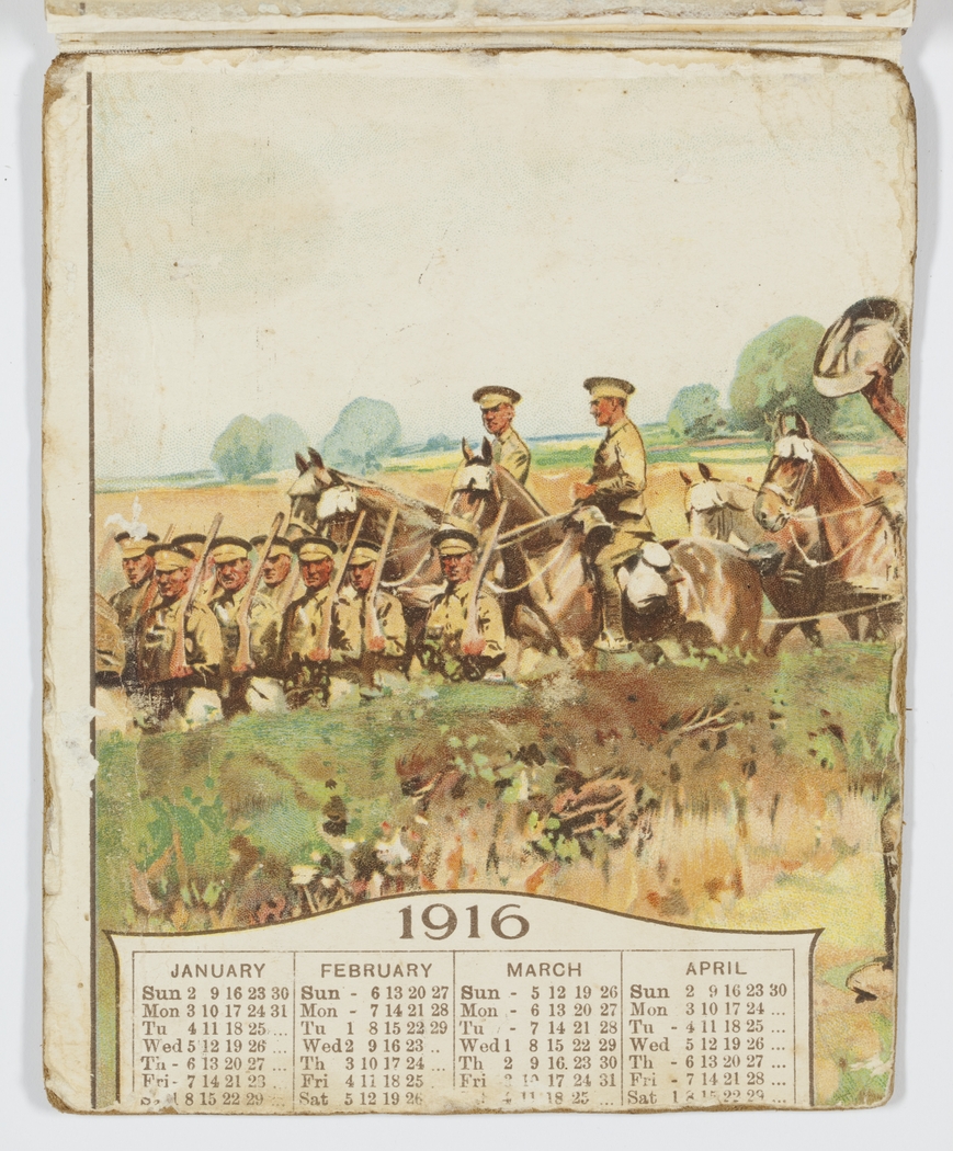 [Calender 1916 – Jan-April with photo of marching men and two officers on horseback]