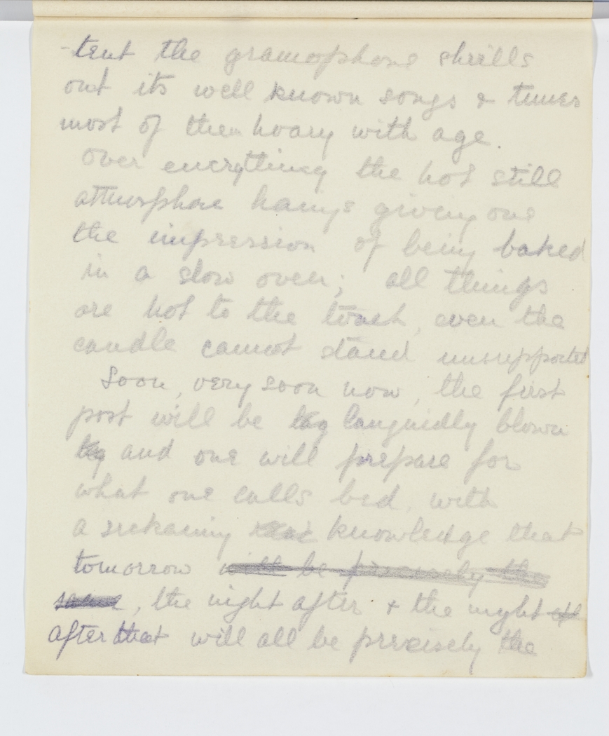 Over everything the hot still atmosphere hangs giving one the impression of being baked in a slow oven; all things are hot to the touch, even the candle cannot stand unprotected.