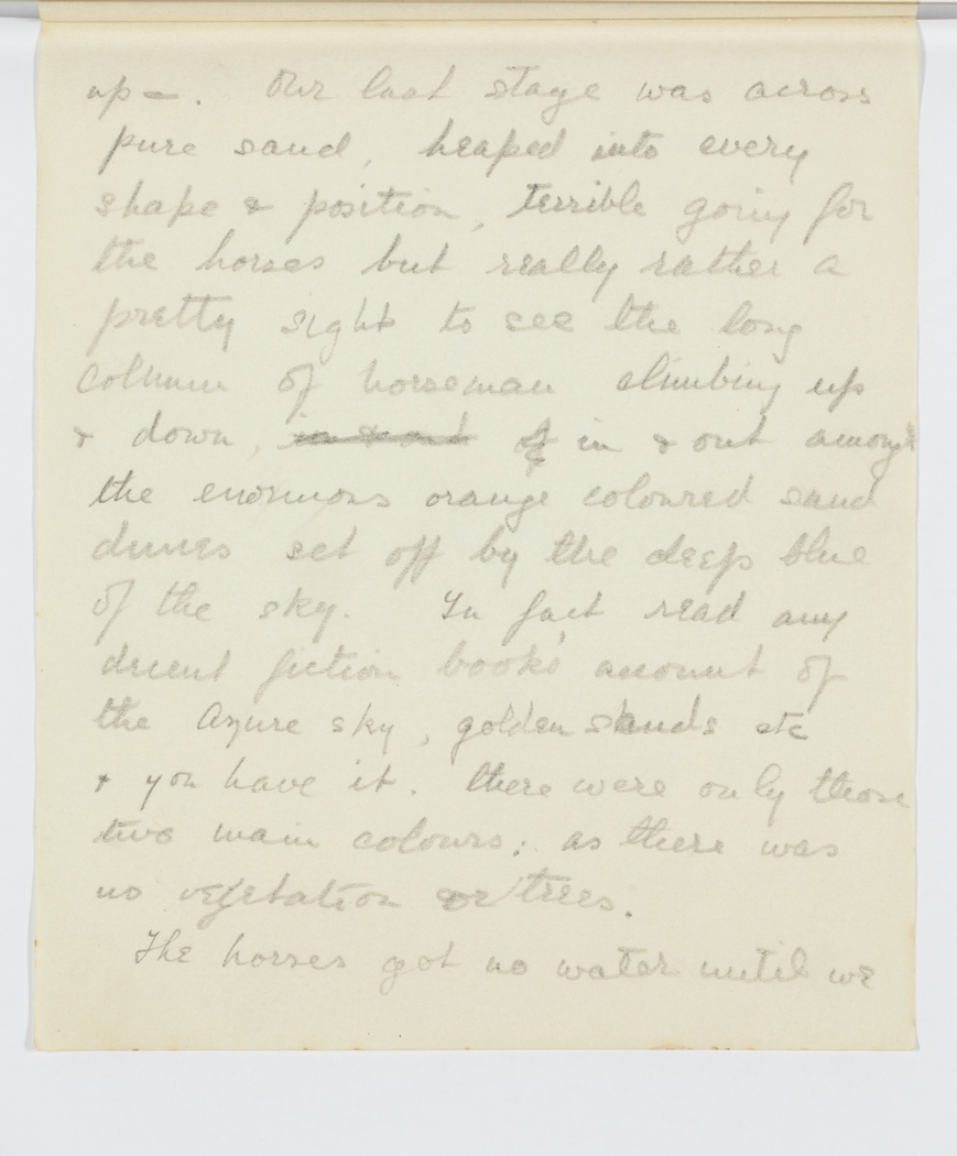 up – our last stage was across pure sand, heaped into every shape & position, terrible going for the horses but really rather a pretty sight to see the long column of horseman climbing up & down in sand of in & out amongst the enormous orange coloured sand dunes set off by the deep blue of the sky. In fact read any decent fiction books' account of the Azure sky, golden sands etc & you have it. there were only these two main colours, as there was no vegetation or trees.