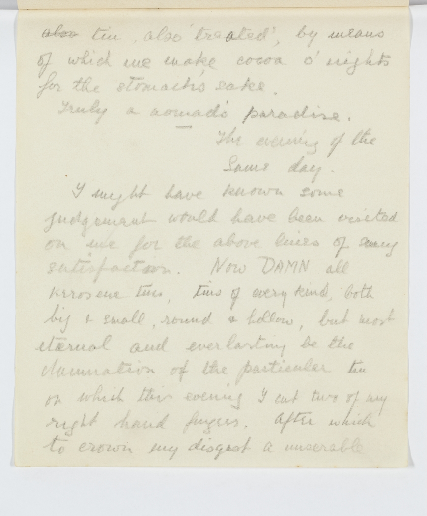 I might have known some judgement would have been visited on me for the above lines of my satisfaction. Now DAMN all kerosene tins, tins of every kind, both big & small, round & hollow, but most eternal and everlasting be the damnation of the particular tin on which this evening I cut two of my right hand fingers. After which to crown my disgust a miserable