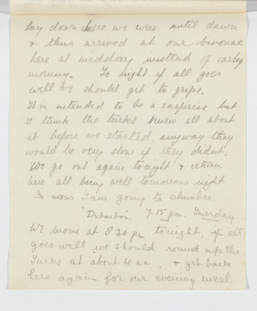 lay down where we were until dawn & thus arrived at our bivouac here at midday instead of early morning. Tonight if all goes well we should get to grips. It is intended to be a surprise but I think the turks knew all about it before we started, anyway they would be very slow if they didn't. We go out again tonight & return here all being well tomorrow night. So now I am going to slumber.
