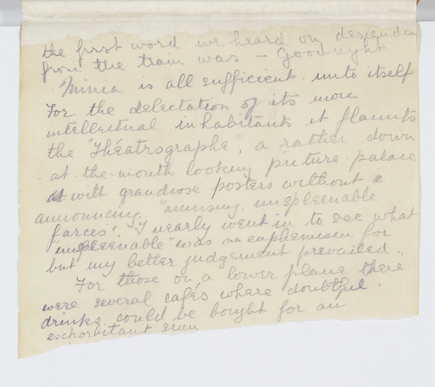 For the delectation of its more intellectual inhabitants it flaunts "Theatrographe, a rather down at the mouth looking picture palace at with grandiose posters without announcing "amusing unspleenable farces". I nearly went into see what unspleenable" was an euphanism for but my better judgement prevailed. For those on a lower plane there were several cafes where doubtful drinks could be bought for an exhorbitant sum.