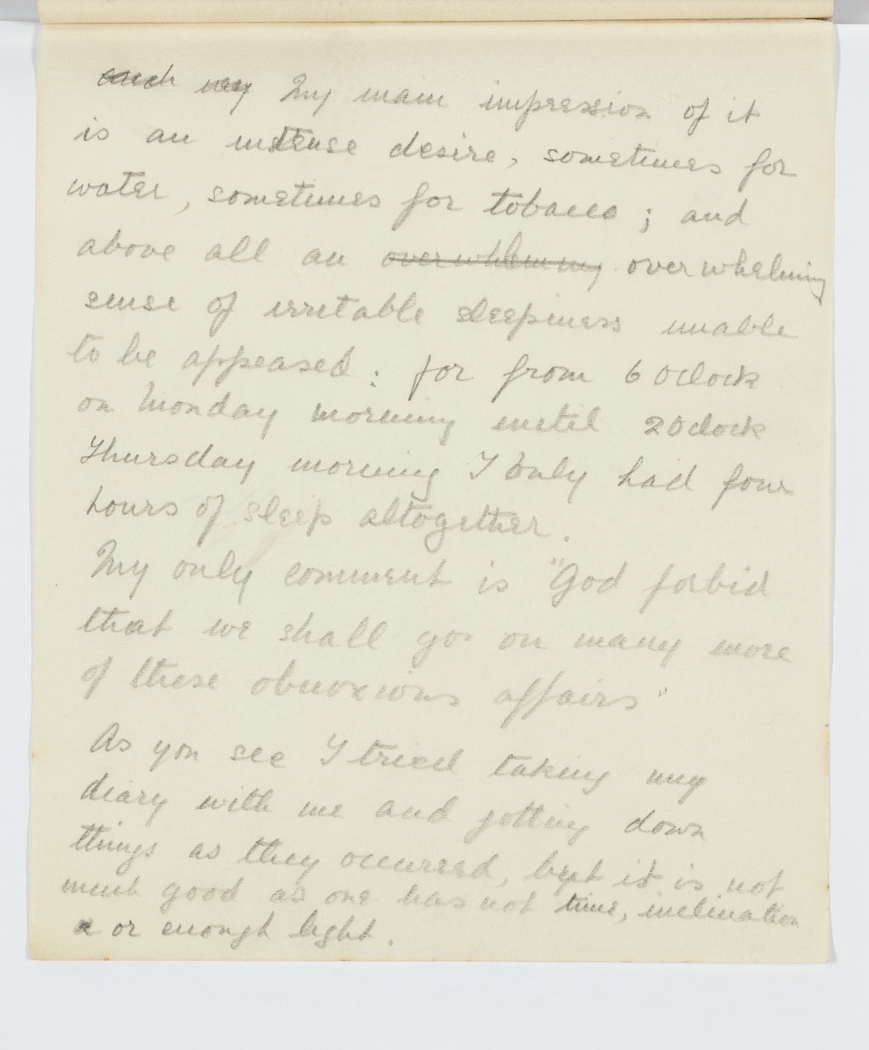 such my My main impression of it is an intense desire, sometimes for water, sometimes for tobacco; and above all an overwhleming overwhelming sense of irritable sleepiness inable to be appeased: for from 6 oclock on Monday morning until 2 oclock Thursday morning I only had four hours of sleep altogether.