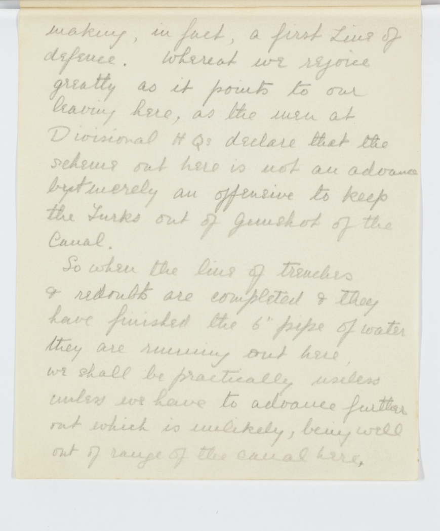 making, in fact, a first Line of defence. Whereat we rejoice greatly as it points to our leaving here, as the men at Divisional H Qs declare that the scheme out here is not an advance but merely an offensive to keep the Turks out of gunshot of the Canal.