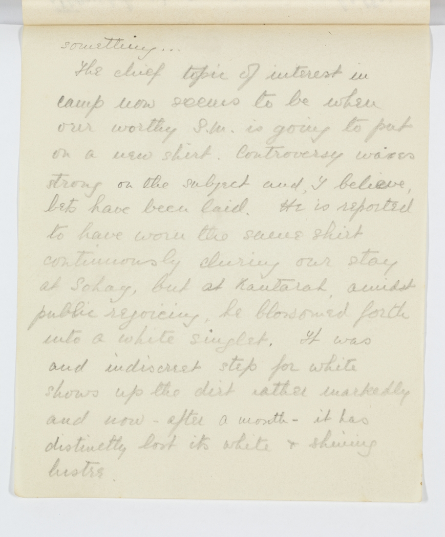 The chief topic of interest in camp now seems to be when our worthy S.M. is going to put on a new shirt. Controversy waxes strong on the subject and, I believe bets have been laid. He is reported to have worn the same shirt continuously during our stay at Sohag, but at Kantarah, amidst public rejoicing, he blossomed forth into a white singlet. It was and indiscreet step for white shows up the dirt rather markedly and now – after a month – it had distinctly lost its white & shining lustre.