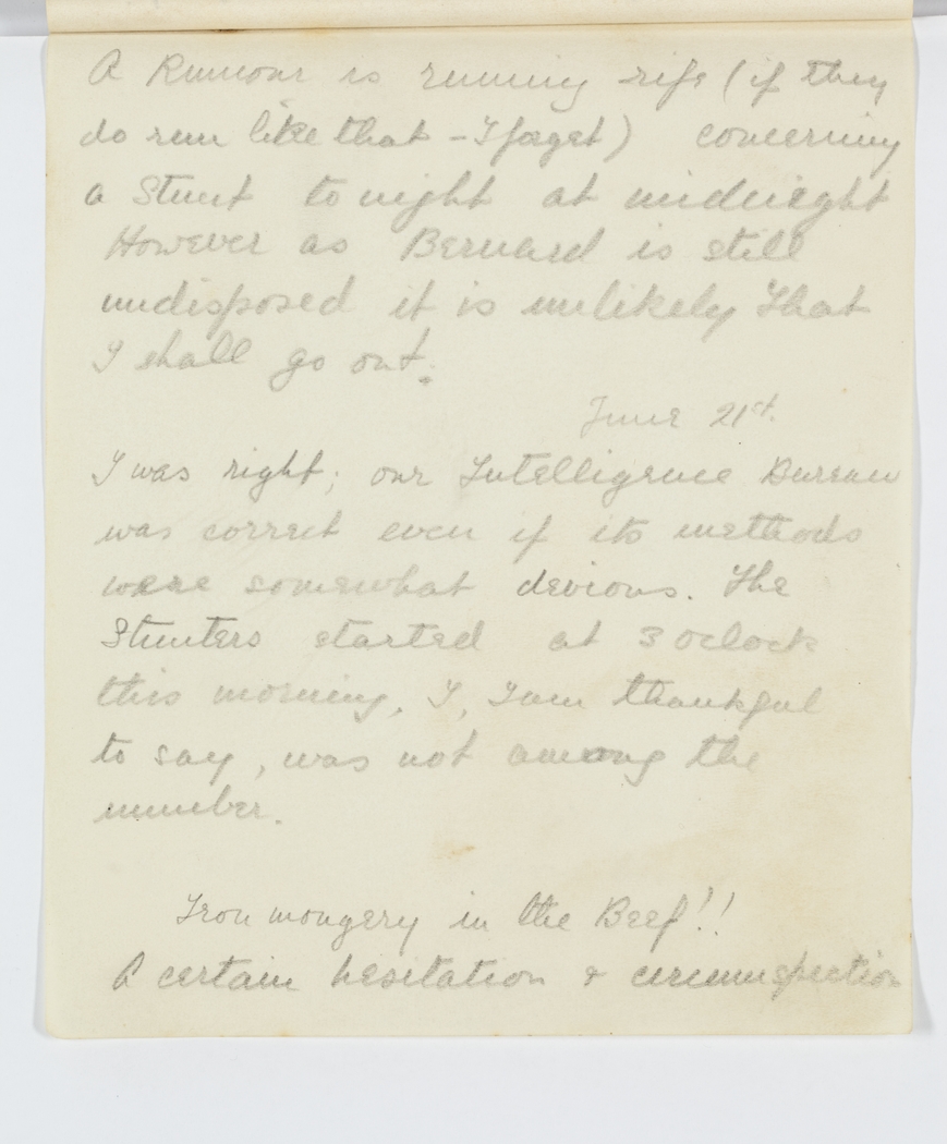 A Rumour is running rife (if they do run like that – I forget) concerning a stunt tonight at midnight However as Bernard is still undisposed it is unlikely that I shall go out.
