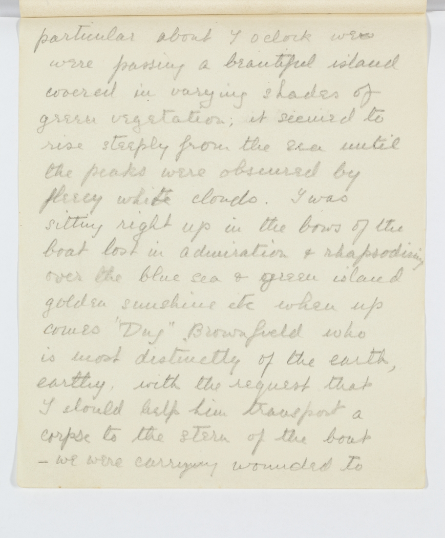 particular about 7 oclock we were passing a beautiful island covered in varying shades of green vegetation; it seemed to rise steeply from the sea until the peaks were obscured by fleecy white clouds. I was sitting right up in the bows of the boat lost in admiration & rhapsodising over the blue sea & green island golden sunshine etc when up comes "Dug" Brownfield who is most distinctly of the earth, earthy, with the request that I should help him transport a corpse to the stern of the boat – we were carrying wounded to