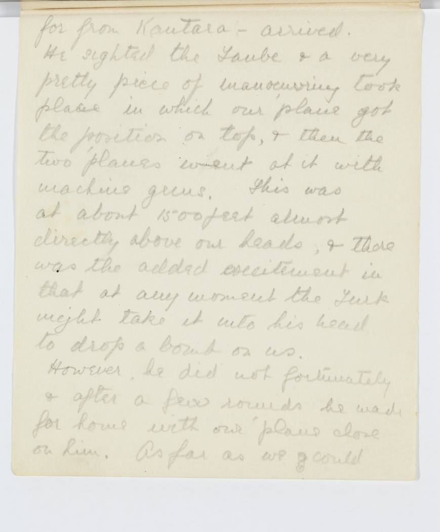 then the two 'planes went at it with machine guns. This was at about 1500 feet almost directly above our heads, & there was the added excitement in that at any moment the Turk might take it into his head to drop a bomb on us.