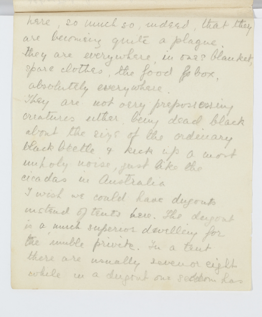 here, so much so, indeed that they are becoming quite a plague. They are everywhere, in ones blanket, spare clothes, the food box, absolutely everywhere. They are not very prepossessing creatures either being dead black about the size of the ordinary black beetle & kick up a most unholy noise, just like the cicadas in Australia.