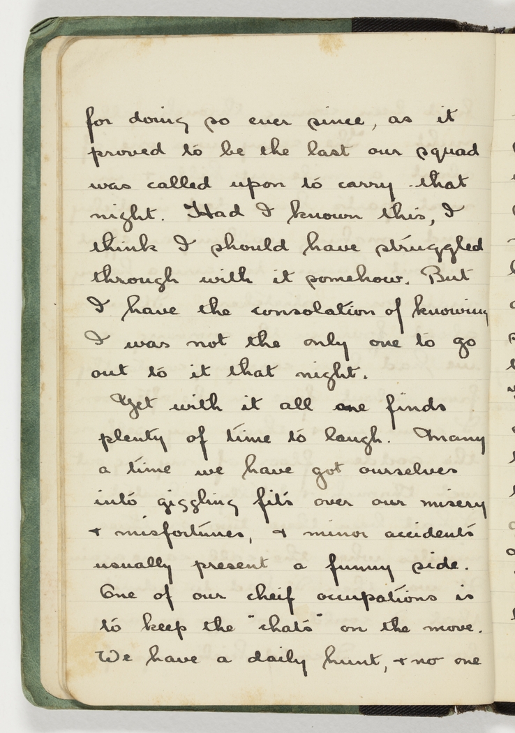 Yet with it all one finds plenty of time to laugh. Many a time we have got ourselves into giggling fits over our misery & misfortunes, & minor accidents usually present a funny side. One of our cheif occupations is to keep the "chats" on the move. We have a daily hunt, & no-one