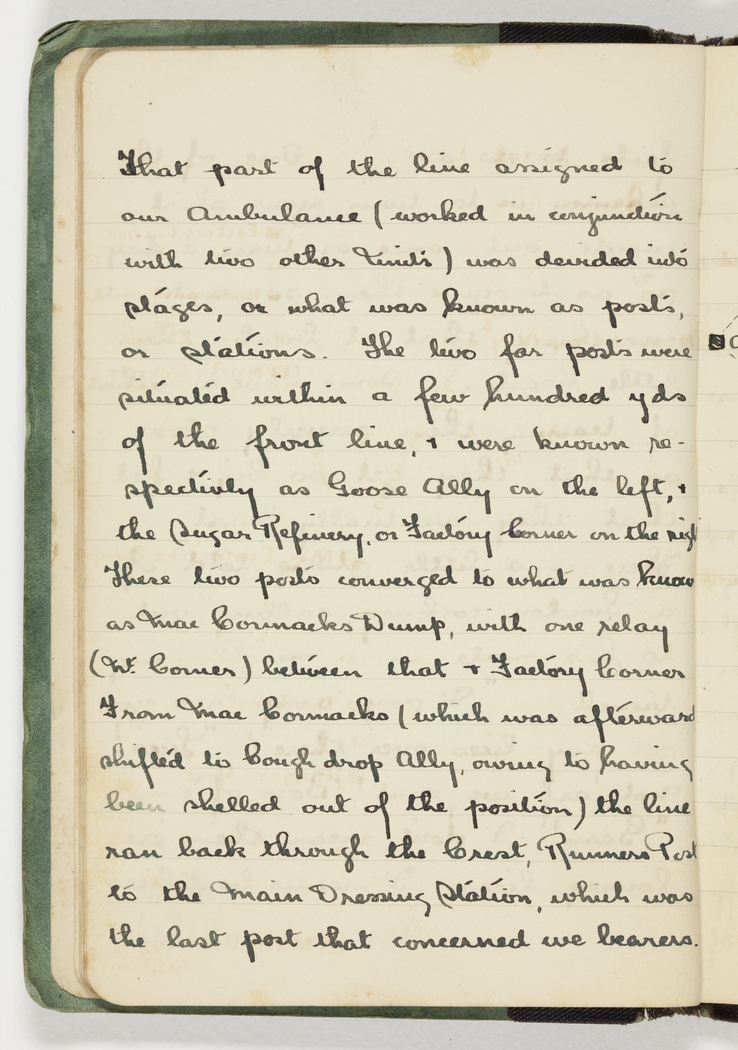 That part of the line assigned to our Ambulance (worked in conjunction with two other Units) was devided into stages, or what was known as posts, or stations. The two far posts were situated within a few hundred yds of the front line, & were known respectivly as Goose Ally on the left, & the Sugar Refinery, or Factory Corner on the right. These two posts converged to what was known as MacCormacks Dump, with one relay (Mt. Corner) between that & Factory Corner. From MacCormacks (which was afterwards shifted to Cough drop Ally, owing to having been shelled out of the position) the line ran back through the Crest, Runners Post to the Main Dressing Station, which was the last post that concerned we bearers.