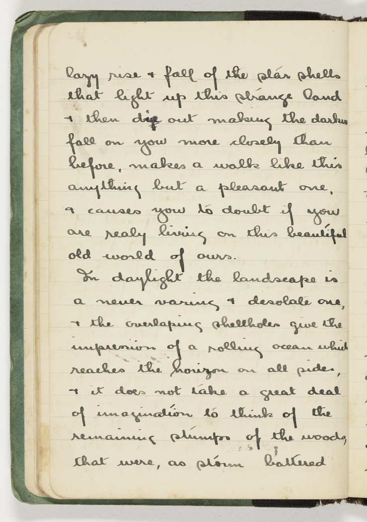 In daylight the landscape is a never varing & desolate one, & the overlaping shellholes give the impression of a rolling ocean which reaches the horizon on all sides, & it does not take a great deal of imagination to think of the remaining stumps of the woods, that were, as storm battered