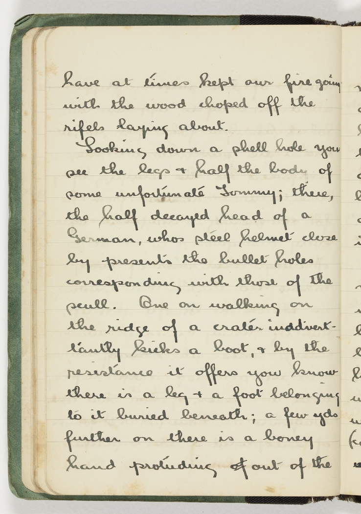 Looking down a shell hole you see the legs & half the body of some unfortunate Tommy; there, the half decayed head of a German, whos steel helmet close by presents the bullet holes corresponding with those of the scull. One on walking on the ridge of a crater inadvertantly kicks a boot, & by the resistance it offers you know there is a leg & a foot belonging to it buried beneath; a few yds further on there is a boney hand protruding of out of the