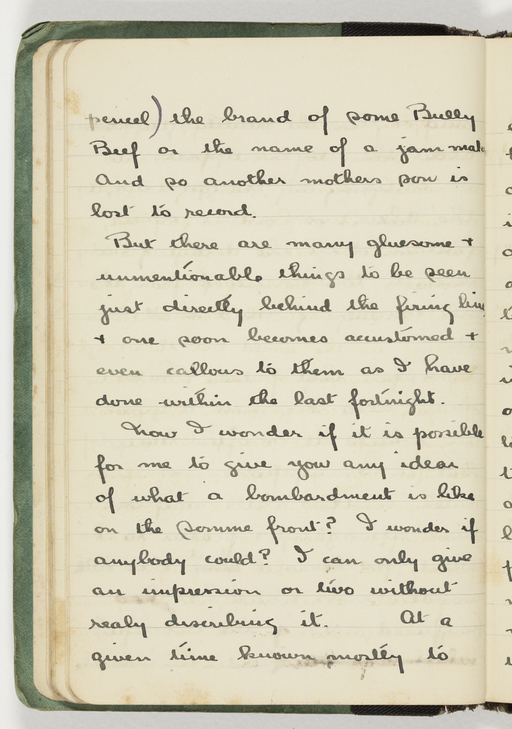 Now I wonder if it is possible for me to give you any idea of what a bombardment is like on the Somme front? I wonder if anybody could? I can only give an impression or two without realy describing it. At a given time known mostly to