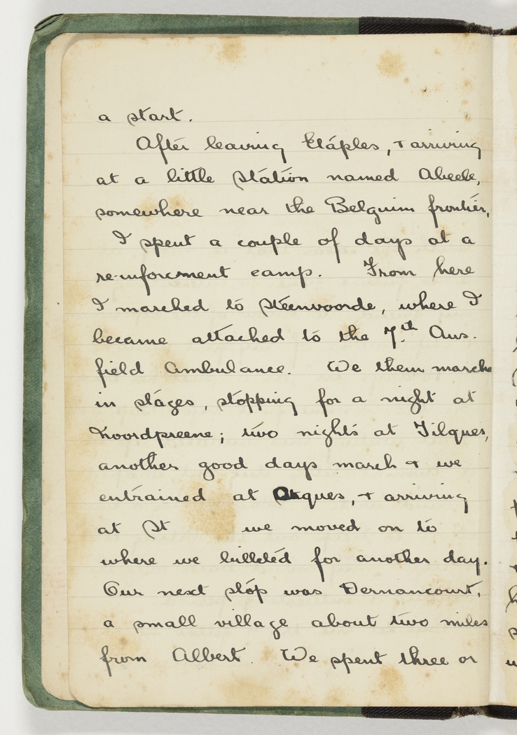 After leaving Etaples, & arriving at a little station named Abeele, somewhere near the Belgium frontier, I spent a couple of days at a re-inforcement camp. From here I marched to Steenvoorde, where I became attached to the 7th Aus. Field Ambulance. We then marched in stages, stopping for a night at Noordpreene; [Noordpeene] two nights at Tilques, another good days march & we entrained at Arques, & arriving at St we moved on to where we billeted for another day. Our next stop was Dernancourt, a small village about two miles from Albert. We spent three or