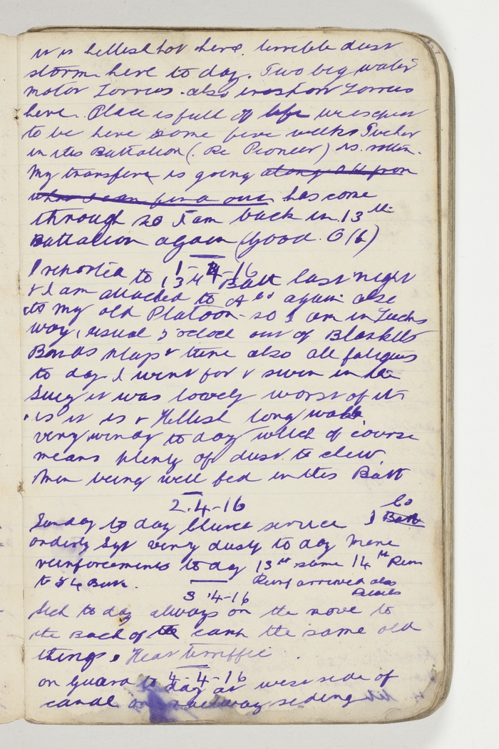 it is hellish hot here. terrible dust storm here to day. Two big water motor lorries also transport lorries here. Place is full of life we expect to be here some five weeks tucker in this Battalion (Re Pioneer) is rotten. My transfer is going along OK from what I can find out has come through so I am back in 13th Battalion again (Good OH)