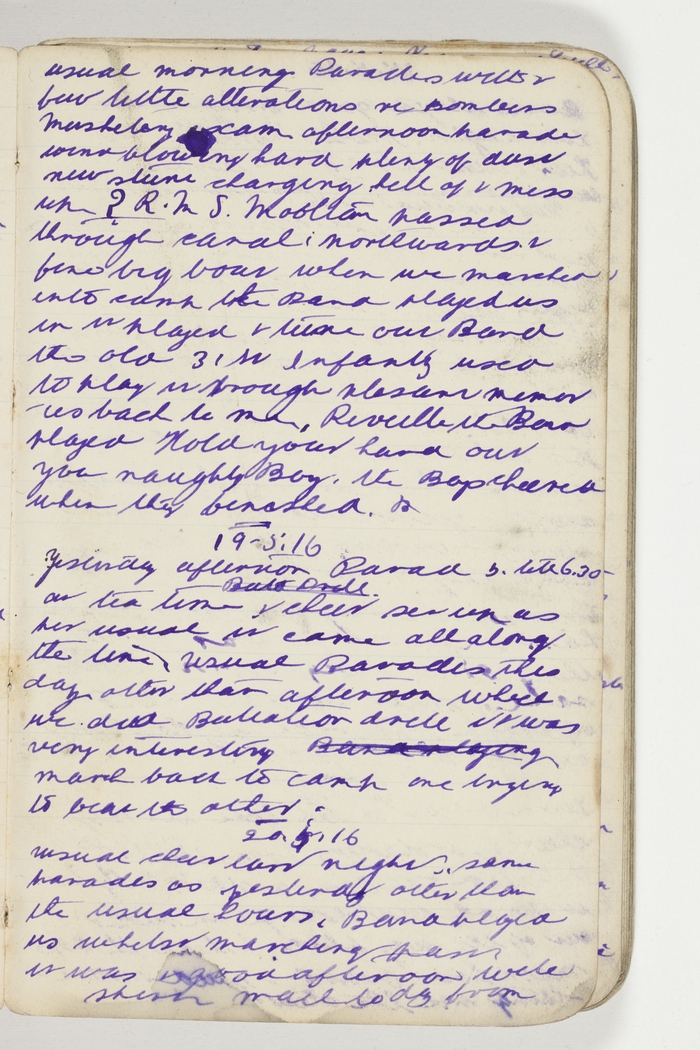 R.M.S. Mooltan passed through canal northwards a fine big boat when we marched into camp the band played us in & played a tune our band the old 31st Infantry used to play it brought pleasant memories back to me. Reveille the band played Hold your hand out you naughty Boy. the boys cheered when they finished.
