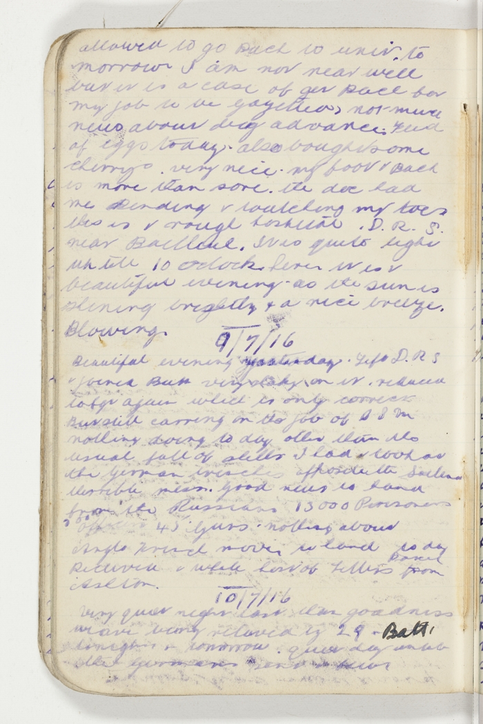 allowed to go back to unit to morrow I am now near well but it is a case of get pace for my job to be gazetted. not much news about big advances. Feed of eggs today also bought some cherries very nice. my foot & back is more than sore. the doc had me bending & touching my toes this is a rough hospital D.R.S. near Bailleul. It is quite light up till 10 oclock here it is a beautiful evening as the sun is shining brightly & a nice breeze blowing.