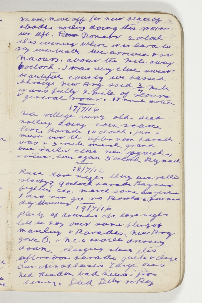 We are move off for new place of abode nothing doing this morn we left. Dom Domart 2 oclock this evening where it is hard to say eventually we arrived at Naours. about ten mile away 6 oclock. I was very close sweat beautiful country we passed through new Brg said ¾ mile it was fully 2 mile of [indecipherable] general [indecipherable], 15 minutes notice