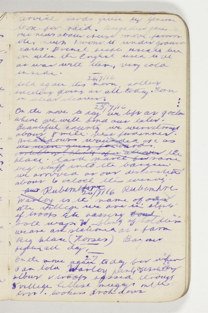 On the move again to day for where I am told Warloy plenty of artillery [indecipherable] & troops passed through village hellish muggy [indecipherable] drop down