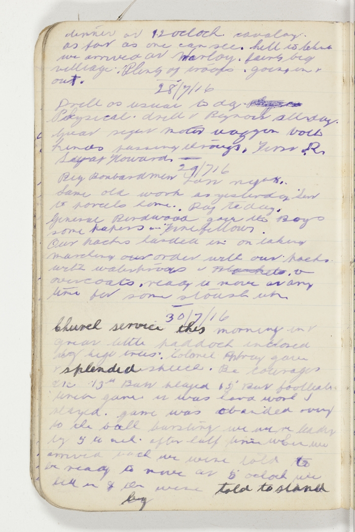 Church service this morning in a great little paddock inclosed by high trees. Colonel [indecipherable] gave a splendid speech. Be courages etc 13th Batt played 15th Batt football [indecipherable] game it was hard work I played. game was obanded owing to the ball bursting we were leading by 5 to nil. after half time when we arrived back we were told to be ready to move at 5 oclock we fell in & then were told to stand by