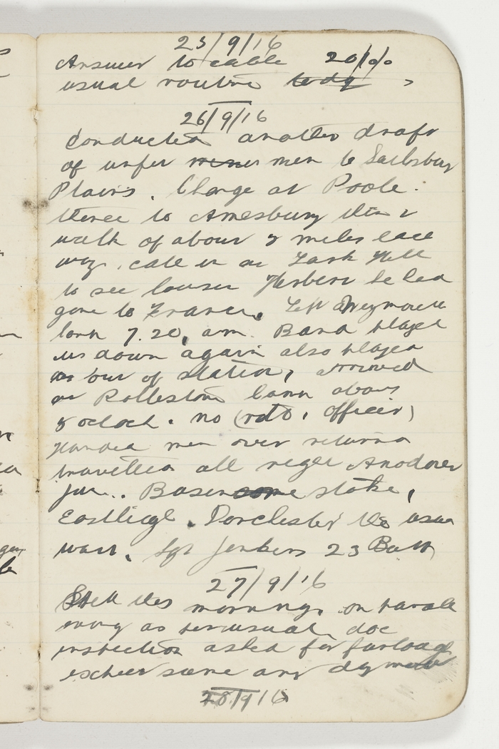 Conducted another draft of unfit men to Salisbury Plains. Change at Poole thence to Amesbury then a walk of about 2 mile each way. call in at Lark Hill to see cousin Herbert he had gone to France. Left Weymouth Camp 7.20 am. Band played us down again also played us out of station, arrived at Rolleston Camp about 5 oclock. no (rto officer) Handed men over returned travelled all night Andover jnc Basingstoke, Eastliegh, Dorchester the usual wait. Sgt Jenkins23 Batt.