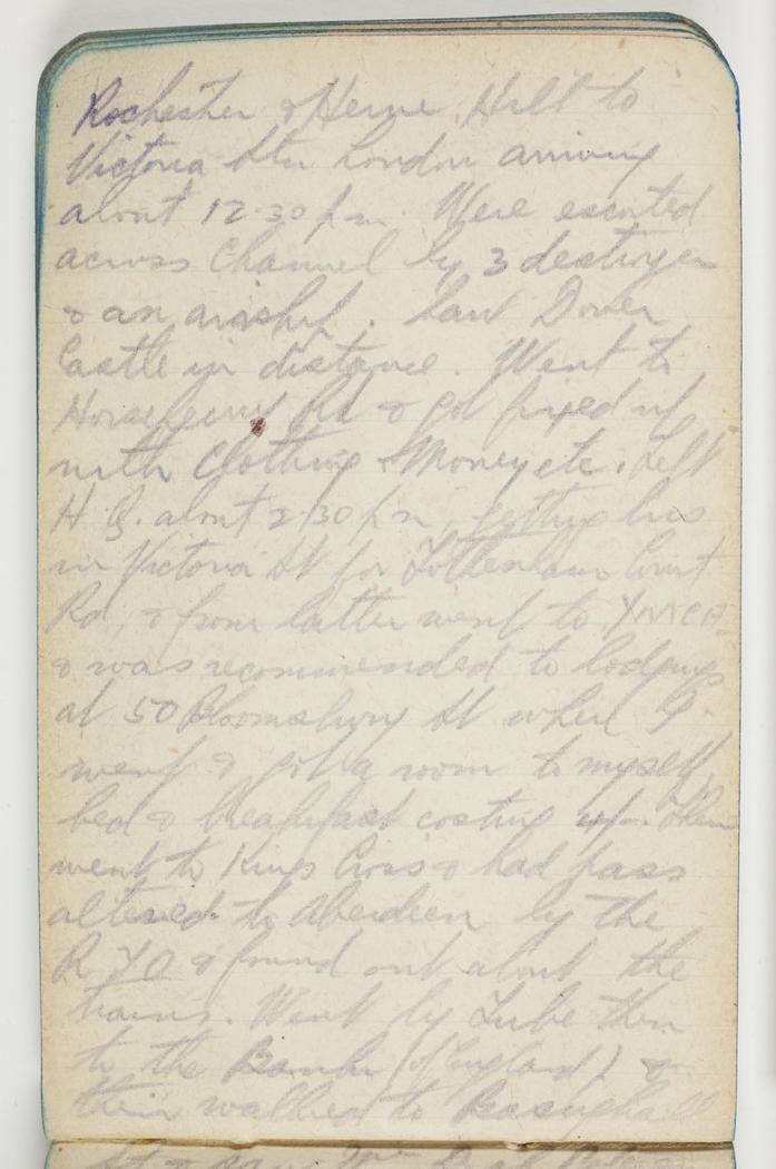 Rochester & Heine Hill to Victoria Station London arriving about 12.30pm. Were escorted across Channel by 3 destroyers & an airship. Saw Dover castle in distance. Went to Horseferry Rd & got fixed up with clothing & money etc. Left H.Q, about 2.30pm getting bus in Victoria St for Tottenham Court Rd, & from latter went to YMCA & was recommended to lodgings in 50 Bloomsbury St where I went & got room to myself, bed & breakfast costing 4/-. Then went to Kings Cross & had pass altered to Aberdeen by the RTO & found out about the train. Went by tube then to the bank (of England) & then walked to Basinghall