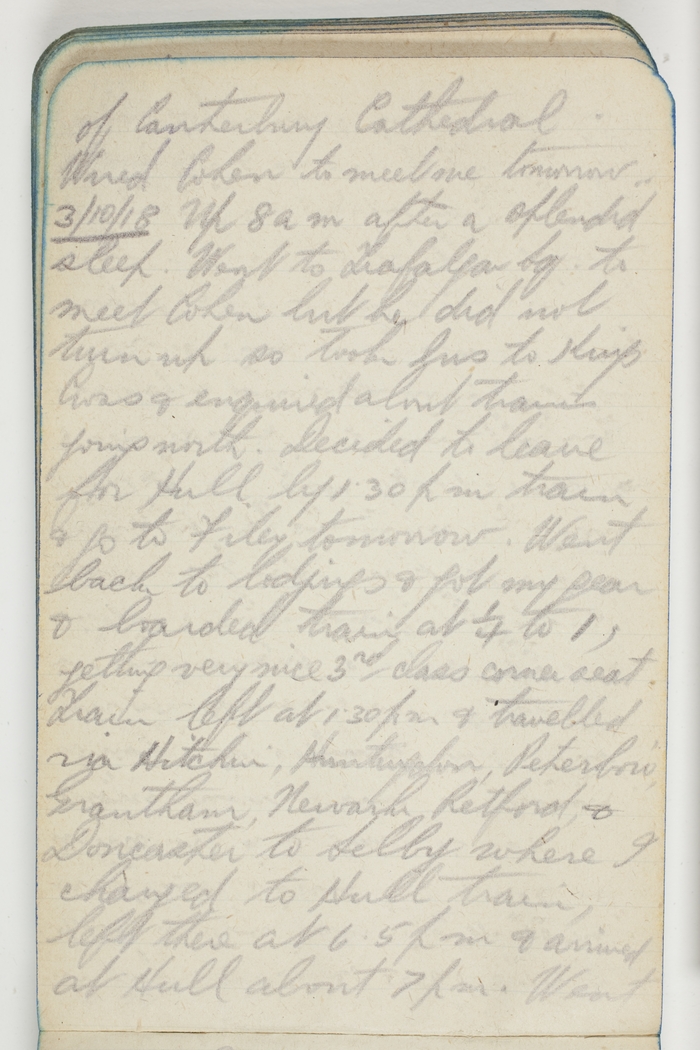 3/10/18 Up 8am after a splendid sleep. Went to Trafalgar Sq. to meet Cohen but he did not turn up so took bus to kings Cross & enquired about trains going north. Decided to leave for Hull by 1.30pm train & go to Filey tomorrow. Went back to lodgings & got my gear & boarded train at ¼ to 1, getting very nice 3rd class corner seat. Train left at 1.30pm and travelled via Hitchin, Huntingdon, Peterboro', Grantham, Newark, Retford & Doncaster to Selby where I changed to Hull train, left there at 6.5pm & arrived at Hull almost 7pm. Went