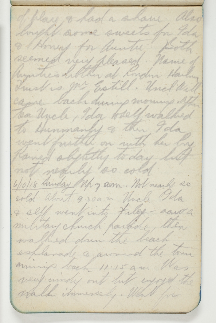 6/10/18 Sunday Up 7am. Not nearly so cold. About 9.30am Uncle Ida & self went into Filey – saw a military church parade, then walked down the beach esplanade & around the town arriving back 11.15am. was very windy out but enjoyed the walk immensely. Went for