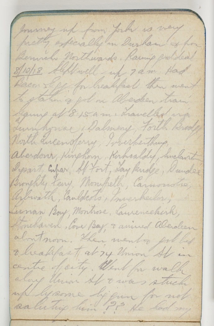 8/10/18 Slept well. Up 7am. had bacon & eggs for breakfast then went to station & got on Aberdeen train leaving 8.15am. Travelled via Turnhouse, Dalmeny, Forth Bridge, North Queensferry, Inverkeithing Aberdour, Kinghorn, Kirkaldy, Sinclairtown, Dysart, Cupar, St Fort, Tay Bridge, Dundee, Broughty Ferry, Monifieth, Carnoustie, Arbroath, Cauldcots, Inverkeilor, Lunan Bay, Montrose, Laurencekirk, Stonehaven, Cove bay, & arrived Aberdeen about noon. Then went & got bed & breakfast at 74 Union St & was stuck up by some big gun for not saluting him?? He had my