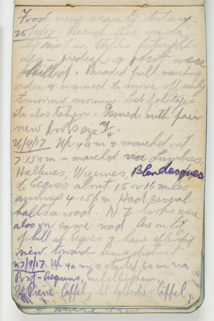 26/9/17 Up 4am & marched out 7.15am – marched via Lumbres, Hallines, Wizernes, Blendecques to Ecques almost 15 or 16 miles arriving at 4.15pm. Had several hats on road. NZ Corps were also on same road. Are on top of hill at Ecques & have splendid view towards Lens district.