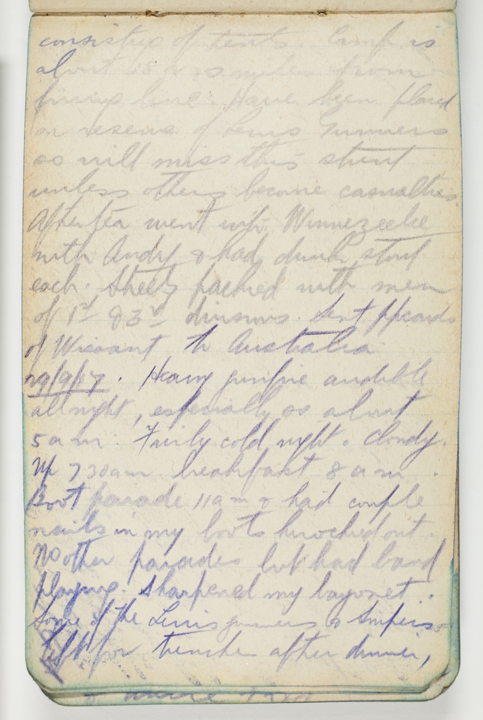 29/9/17 Heavy gunfire audible all night, especially at about 5am. Fairly cold night. Cloudy. Up 7.30am breakfast 8am. Boot parade 11am & had couple nails in my boots knocked out. No other parades but had band playing. Sharpened my bayonet. Some of the Lewis gunners & Snipers left for trenches after dinner,