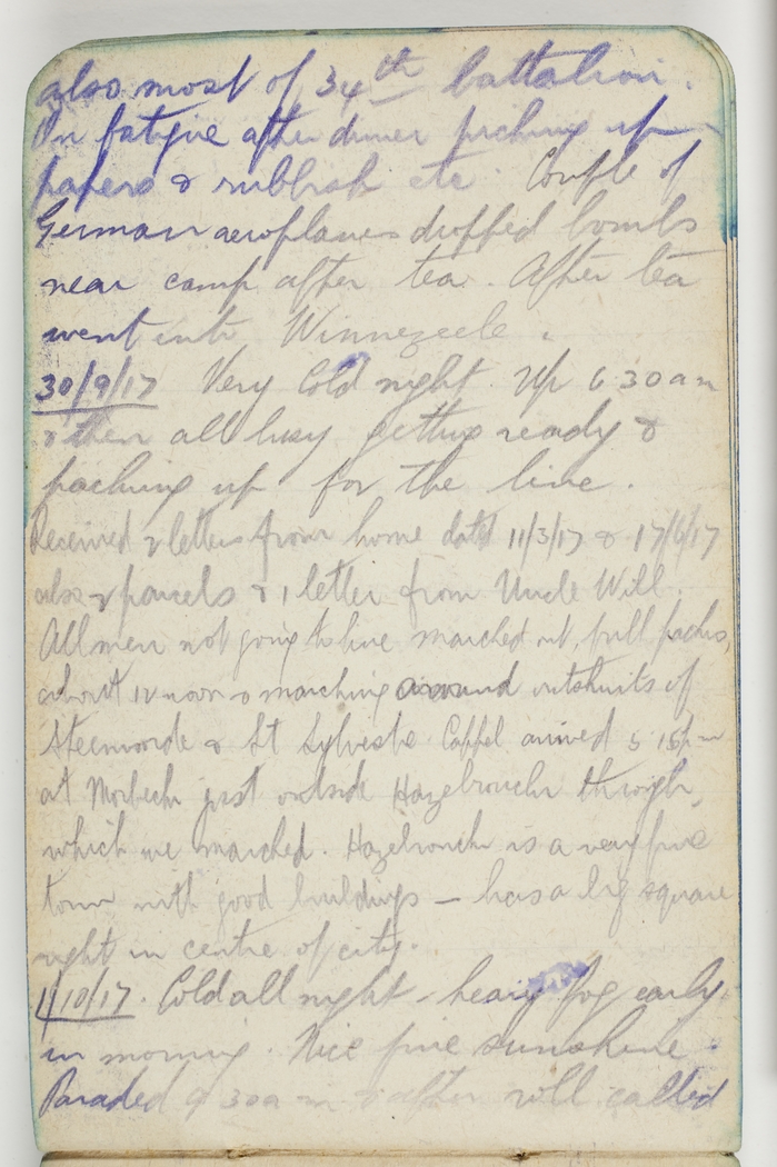 30/9/17 Very cold night. Up 6.30am & then all busy getting ready & packing up for the line. Received 2 letters from home dated 11/3/17 & 17/6/17 also 2 parcels & 1 letter from Uncle Will. All men not going to line marched out, full packs, about 12 noon & marching around the outskirts of Steenvoorde & St Sylvestre-Cappel arrived 5.15pm at Morbeck just outside Hazebrouck through which we marched. Hazebrouck is a very fine town with good buildings – has a big square right in centre of city.