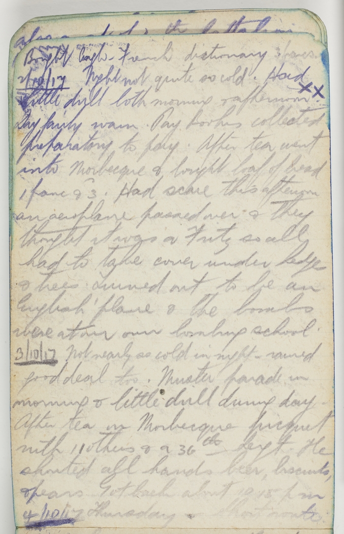 2/10/17 Night not quite so cold. Had little drill both morning & afternoon. Day fairly warm. Pay books collected preparatory to pay. After tea went into Morbecque & bought loaf of bread 1 franc & 3. Had scare this afternoon an aeroplane passed over & they thought was a Fritz so all had to take cover under hedges & trees. Turned out to be an English plane & the bombs were at our own bombing school.